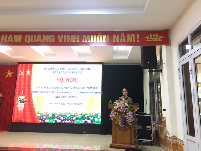 Ngày 12/9/2022 - Ngành Giáo dục và Đào tạo quận Lê Chân -Tập huấn bồi dưỡng nghiệp vụ thanh tra, kiểm tra, công tác pháp chế, công khai, xử lý vi phạm hành chính, trong lĩnh vực giáo dục. Năm học 2022 -2023. Tới Hướng dẫn và triển khai nhiệm vụ có các đồng chí: Đào Bá Minh - Tránh thanh tra Sở GD & ĐT Hải Phòng; Đồng chí: Nguyễn Thị Lệ Thủy - Trường phòng Giáo dục và Đào tạo quận Lê Chân. Cùng các đồng chí là lãnh đạo phòng thanh tra sở, phòng Giáo dục và Đào tạo, các đồng chí Hiệu trưởng, phó Hiệu trưởng, chủ tịch công đoàn, ban thanh tra các trường thuộc quận Lê Chân.